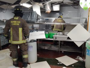 El encargado de despacho de la dirección de Bomberos, Arturo Sosa Muñoz, reportó que el informe se recibió a las 9:12 horas de este martes 06 de diciembre sobre un local en dicha plaza comercial ubicada en la Supermanzana 6A, por lo que procedió el envío de dos unidades y seis elementos desde la base central para confirmar que se produjo un flamazo por acumulamiento de gas LP en una línea de abastecimiento del área de cocina del restaurante.