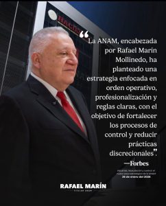 El texto de Forbes subraya que, al frente de la ANAM, Rafael Marín Mollinedo ha impulsado una estrategia centrada en el orden operativo, la profesionalización del personal y el establecimiento de reglas claras, con el objetivo de fortalecer los procesos de control y reducir prácticas discrecionales.