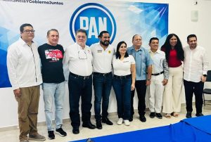 PLAYA DEL CARMEN, 3 de marzo. – Los dirigentes estatales del PAN, PRD y PRI de Quintana Roo, Germán González, Leobardo Rojas y Pedro Flota, respectivamente, acompañados del Vocero Estatal del blanquiazul, Ernesto Sánchez Rodríguez, ofrecieron una conferencia de prensa en el municipio de Solidaridad, bastión panista, para respaldar la candidatura al Senado de Mayuli Martínez Simón.