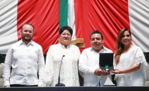 CHETUMAL,7 de agosto. – Por su labor a favor de la promoción y protección de la identidad y el patrimonio cultural de la etnia maya en sus distintas expresiones, los tres Poderes del Estado representados por la diputada Yohanet Torres Muñoz, presidenta de la Mesa Directiva de la Comisión Permanente, la gobernadora Mara Lezama Espinosa y el magistrado Heyden Cebada Rivas, presidente del Tribunal Superior de Justicia entregaron la medalla al Mérito Indígena Maya “Cecilio Chi” a Wildernain Villegas Carrillo.