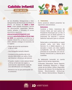 Pueden participar las niñas y niños de 6 a 11 años que estén cursando la educación primaria en cualquiera de las instituciones educativas del municipio, quienes deberán presentar una ponencia junto con su copia de acta de nacimiento o CURP, una fotografía tamaño infantil, constancia de estudios del ciclo escolar 2024-2025 con sello y firma del director o directora del plantel, además del formato de registro debidamente llenado con la autorización del papá, mamá o tutor, quien también deberá adjuntar copia de una identificación con fotografía.