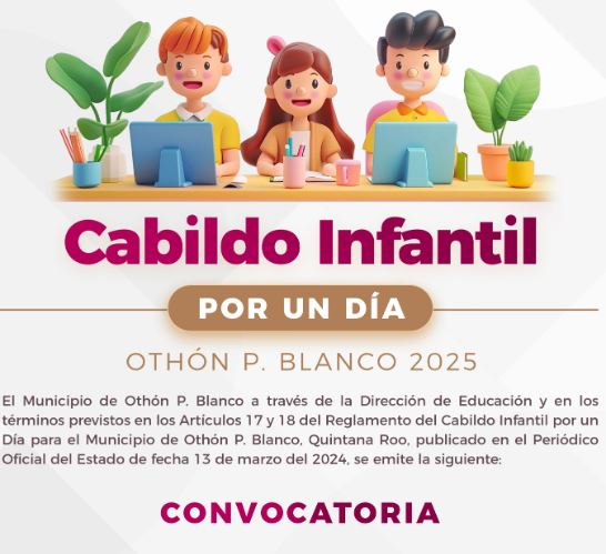 CHETUMAL, 12 de mayo. El Ayuntamiento de Othón P. Blanco, a través de la Dirección de Educación, invita a las niñas y niños a ser parte del “Cabildo Infantil por un Día”, un espacio donde su voz es escuchada y cuenta mucho para seguir con la Transformación del Municipio.