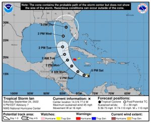 La tormenta tropical “Ian” está presentando una trayectoria cambiante, por lo que la Coordinación Estatal de Protección Civil, pide a la ciudadanía mantenerse atenta e informada, y estar al pendiente de las publicaciones que se emiten de la posible trayectoria del sistema ciclónico, así como no hacer caso a rumores.