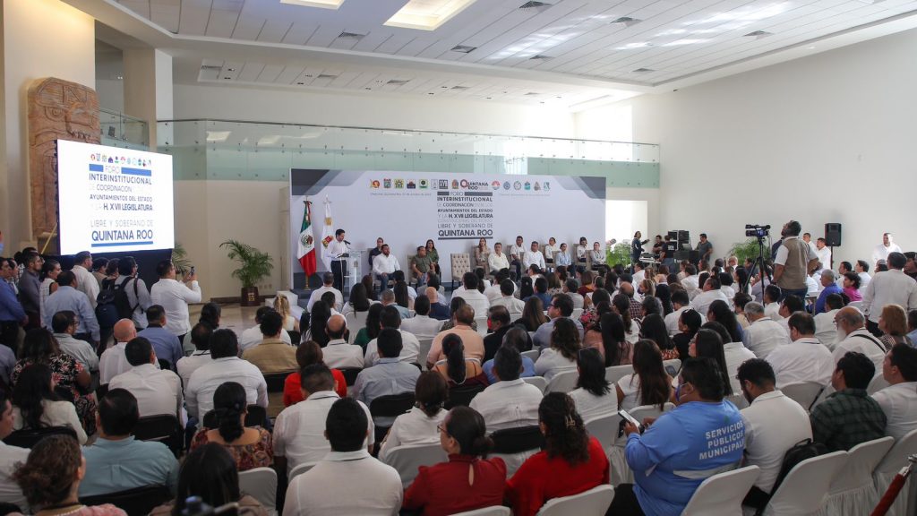 Chetumal, 27 de octubre. – Con el propósito de fortalecer la labor de los municipios y generar las condiciones para la implementación de políticas públicas a favor del pueblo, se llevó a cabo el Foro Interinstitucional de Coordinación entre los Ayuntamientos y la XVII Legislatura, un espacio de diálogo e interlocución donde se intercambiaron puntos de vista, opiniones y propuestas para que se traduzcan en políticas públicas a favor de los quintanarroenses.