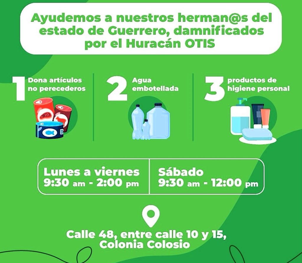 La Casita Verde está ubicada sobre la calle 48 entre 10 y 15 de la colonia Colosio en un horario de atención de lunes a viernes de 9:30 am a 2: 00 pm y sábado de 9:30 am a 12:00 pm; sin embargo, se prevé instalar módulos de acopio en otros puntos de la ciudad. Se pueden donar artículos no perecederos, agua embotellada, productos de higiene personal, entre otros
