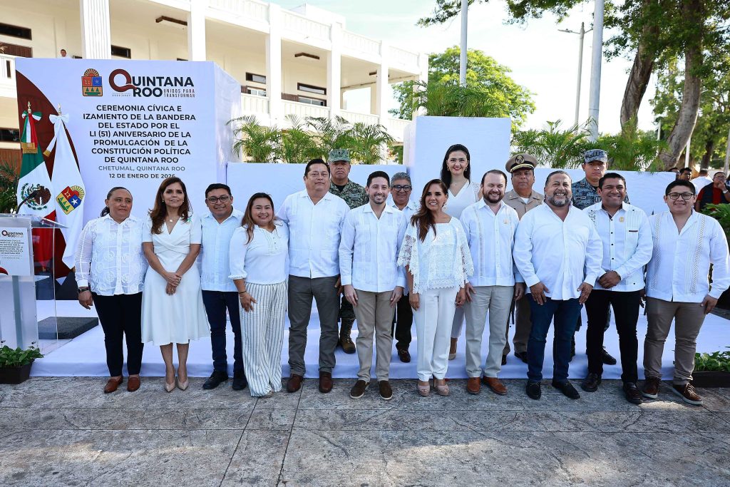 CHETUMAL, 12 de enero de 2026.- Este día se llevó a cabo la Ceremonia Cívica e Izamiento de la Bandera del Estado con motivo del 51 Aniversario de la Promulgación de la Constitución Política de Quintana Roo, donde el presidente del Congreso, Renán Sánchez Tajonar, destacó que la Constitución es el pilar que guía la transformación, la justicia y el bienestar de los quintanarroenses.