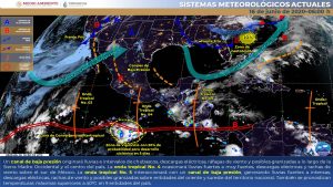 La onda tropical No. 5 se desplazará sobre el sureste de la República e interaccionará con un canal de baja presión ubicado en el sur del Golfo de México, generando lluvias fuertes a intensas, descargas eléctricas, rachas de viento y posibles granizadas sobre entidades del oriente y sureste del territorio nacional.