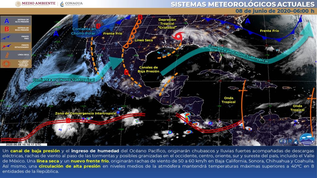 Este día un canal de baja presión en el interior del territorio nacional y el ingreso de humedad del Océano Pacífico, originarán chubascos y lluvias fuertes acompañadas de descargas eléctricas, rachas de viento al paso de las tormentas y posibles granizadas en el occidente, centro, oriente, sur y sureste del país, incluido el Valle de México.