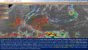 Mientras que canales de baja presión sobre el interior y sureste del territorio nacional, en interacción con el ingreso de humedad del Golfo de México y del Océano Pacífico, ocasionarán lluvias muy fuertes a puntuales intensas en Puebla, Veracruz, Oaxaca, Chiapas y Tabasco, además de chubascos con lluvias puntuales fuertes sobre el noroeste, occidente y centro del país, incluyendo el Valle de México, todas acompañadas de descargas eléctricas, rachas de viento durante el paso de las tormentas y posibles granizadas.