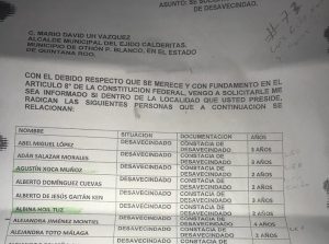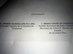 Fue la misma funcionaria de la Procuraduría Agraria, María Guadalupe Ku Lira, la que trató de sorprender al alcalde de Calderitas Mario David Uh Vázquez y al sub delegado de Luis Echeverría, Uriel Jiménez para que les firmaran las cartas de “Desavecindados” tal como lo trató de realizar en el ejido de Sabidos donde también pretendían depurar el 50 por ciento del padrón ejidal.