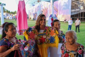 Entre las artesanas estuvo Ramona Puc Cocom, ganadora del premio a la Trayectoria Artesanal 2023 en el XLVIII Gran Premio Nacional de Arte Popular 2023. Tiene una trayectoria de más de 40 años en el urdido de hamacas, tintes naturales, bordados, hilo contado y deshilado, herencia de su madre Melisia Cocom Hoil.