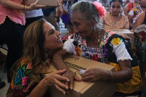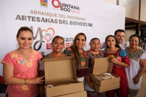 Tras la explicación, la gobernadora Mara Lezama, fiel a su costumbre, entregó uno a uno, mano en mano, los paquetes de insumos a los artesanos, no sin antes exhortarlos a usar las Caravanas del Bienestar, que les proporcionan servicios gratuitos para el cuidado de la salud.