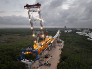 CHETUMAL, 22 de enero. – En la construcción del Puente Nichupté, la Secretaría de Infraestructura, Comunicaciones y Transportes (SICT) emprendió el pasado 12 de enero las primeras actividades del sistema Top Down: realizó el primer montaje de trabes del claro 37 al 38. Un claro es la distancia entre dos apoyos, en este caso la distancia es de 35 m. A finales de este mes se realizará el inicio de la cimentación.