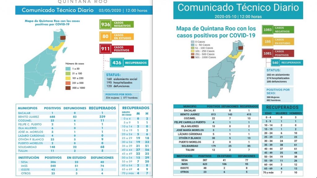 En lo que se refiere a defunciones, el 3 de mayo se registraron 120 y al corte del 10 de mayo eran 185, que resulta en un promedio diario de que 8 personas mueren diariamente por COVID-19; en esta misma semana que se informa, en Cancún ocurrieron 60 fallecimientos, a razón de 7 por día.