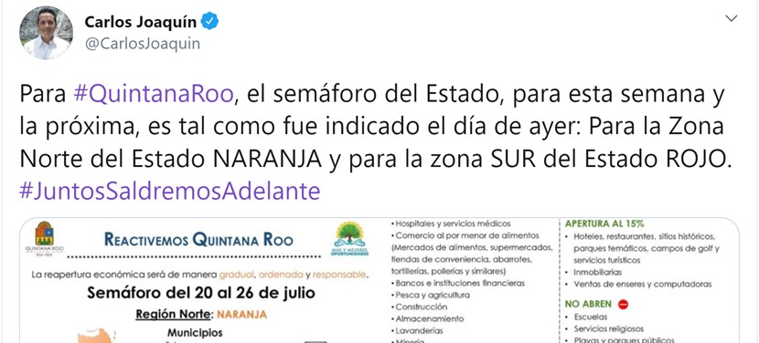 Chetumal, Q.R. – Sigue en NARANJA el Semáforo de Riesgo Epidemiológico para el Norte de Quintana Roo, mientras que para los municipios del Sur, se mantiene en ROJO, anunció el gobernador Carlos Joaquín; por otra parte, Carlos Orvañanos Rea, coordinador de Comunicación Social, anunció que ofrecerá un mensaje el sábado 18 de julio a todos los quintanarroenses para especificar sobre el tema.