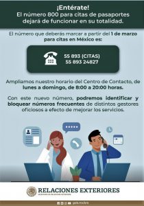 CHETUMAL, 26 de febrero.- La Secretaría de Relaciones Exteriores anunció el nuevo número del Centro de Contacto para agendar citas para el trámite de pasaporte en territorio nacional, en cualquiera de las 47 Oficinas de Pasaportes y Oficinas Municipales de Enlace con la SRE que se encuentran ubicadas en la República Mexicana.