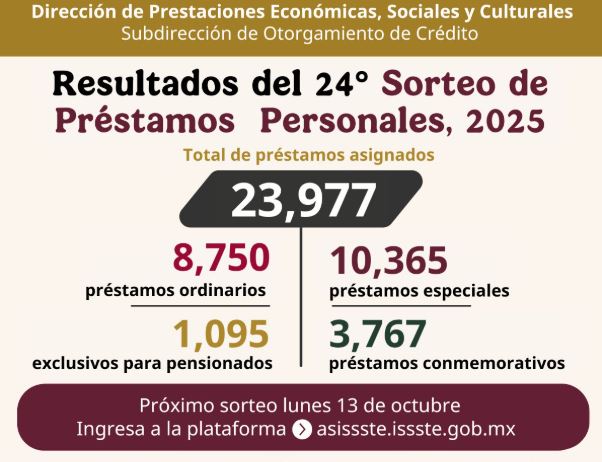 CIUDAD DE MÉXICO, a 3 de octubre. – El Instituto de Seguridad y Servicios Sociales de los Trabajadores del Estado (ISSSTE), encabezado por el director general Martí Batres Guadarrama, informa que en el vigésimo cuarto sorteo convencional del Programa Anual de Préstamos Personales 2025 se asignaron 23 mil 977 créditos, salieron todos aquellos que cumplieron los requisitos.