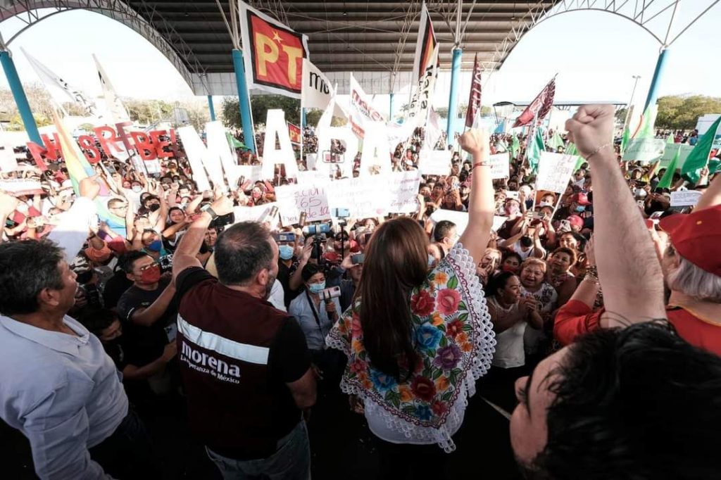 “Hay que consolidar la Cuarta Transformación para cambiar la relación entre el gobierno, sus líderes y la comunidad”, dijo la abanderada de Morena, PVEM, PT y FxM ante seguidores provenientes de comunidades como Sacalaca, Dziuché, Venustiano Carranza, X-Cabil, López Mateos, Mariano Matamoros, Plan de la Nación Poniente, Nueva Reforma y La Pimientita, quienes llegaron a la Unidad Deportiva José María Morelos en ruidosa caravana de vehículos.