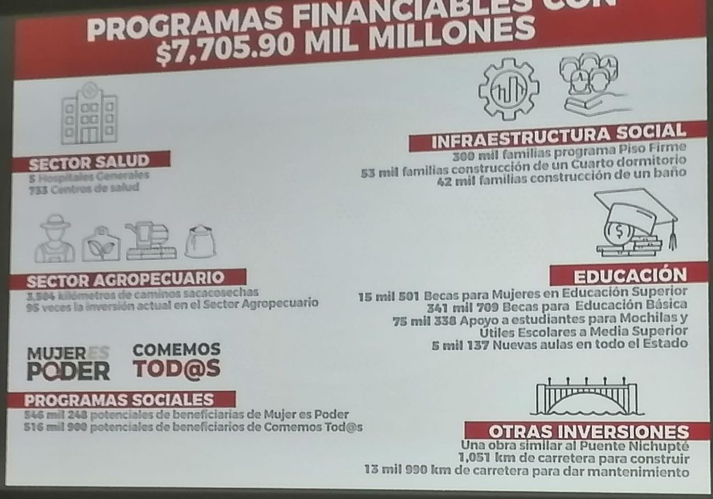 En el tema de salud, los recursos eran para la construcción de cinco hospitales generales y 733 centros de salud; mientras que, en el agropecuario, tres mil 504 kilómetros de caminos “sacacosechas” y 95 veces la inversión actual en el sector.