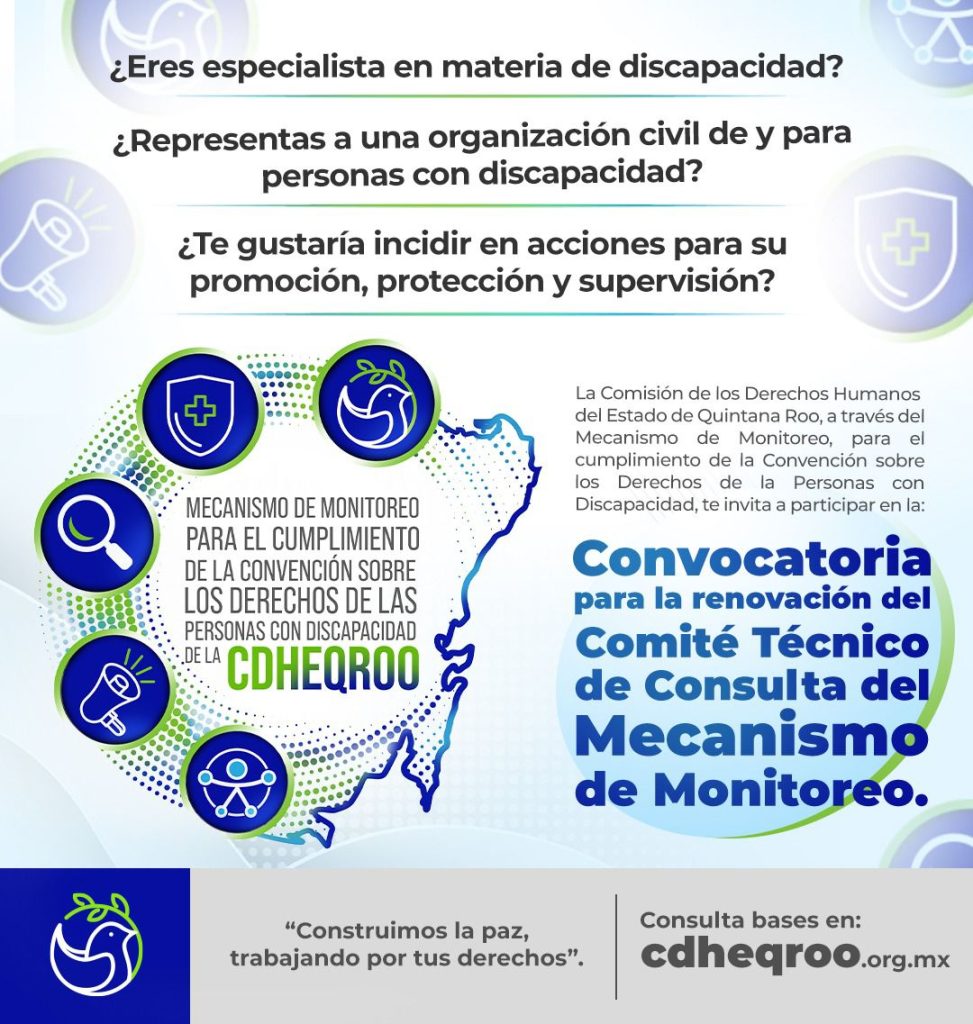 CHETUMAL, 15 de julio. – La Comisión de los Derechos Humanos del Estado de Quintana Roo emitió la convocatoria para renovar el Comité Técnico de Consulta del Mecanismo de Monitoreo para el cumplimiento de la Convención sobre los Derechos de las Personas con Discapacidad.