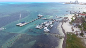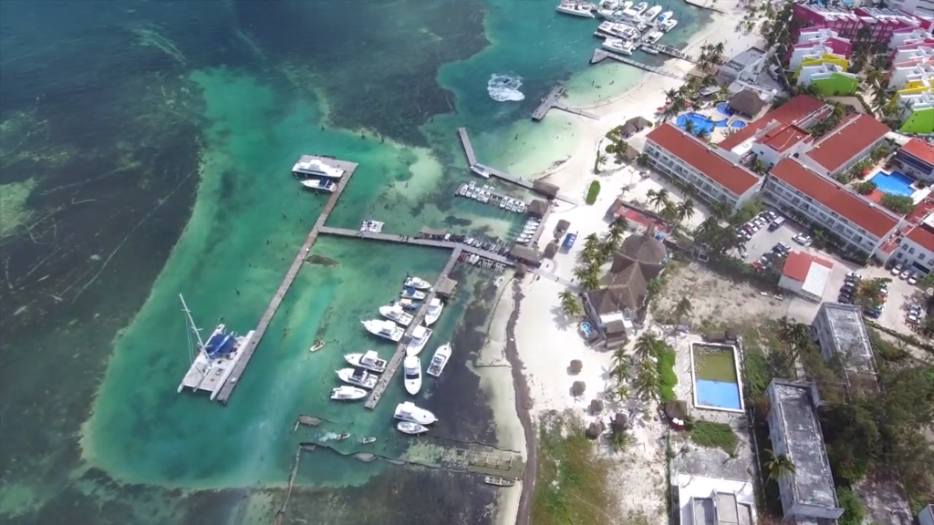 Con imágenes de un dron, se puede observar la zona devastada en cuanto a los pastos marinos, el crecimiento de los muelles, y la zona que hoy el enfrentamiento entre particulares, mantiene frenado un proyecto para crear una playa pública para el goce y disfrute de turistas y habitantes de Quintana Roo.