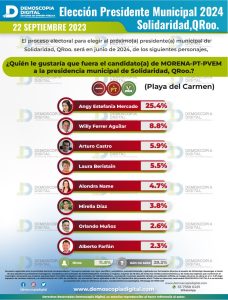 Posteriormente, el 26 de septiembre pasado, la empresa Demoscopía Digital, en los resultados de las preferencias electorales del municipio de Solidaridad, rumbo al 2024 para la presidencia municipal, ubicó a Estefanía Mercado en la primera posición con 25.4 puntos porcentuales.