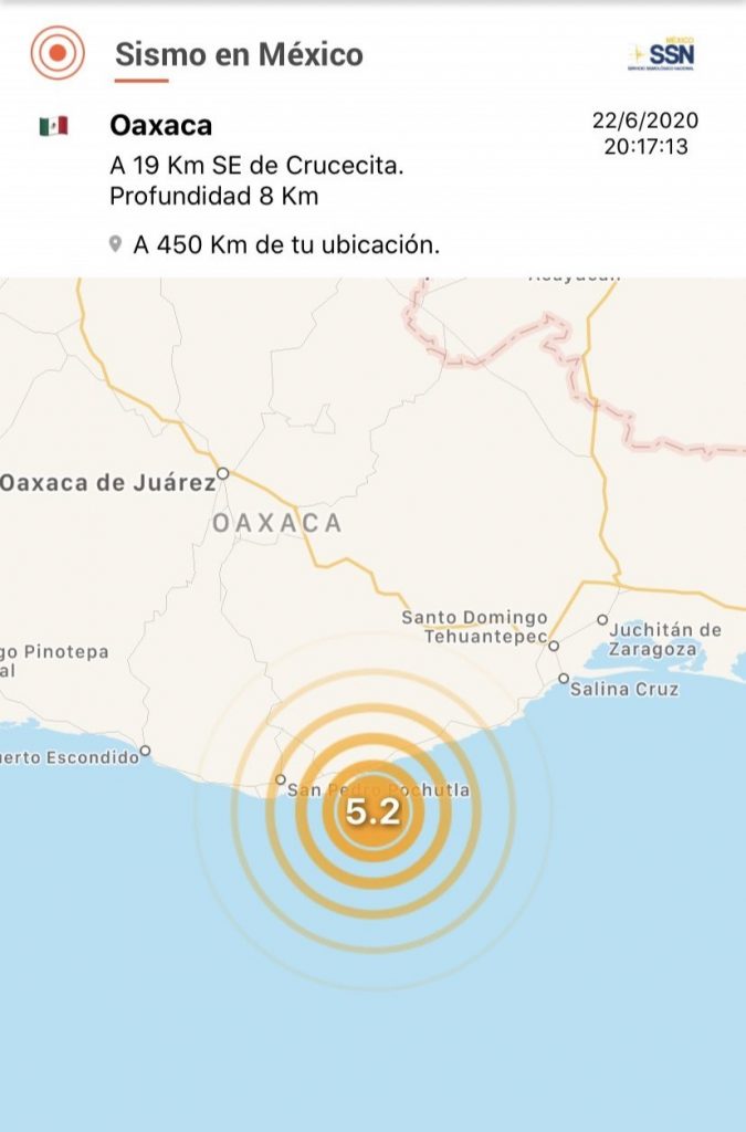 SSN ajusta magnitud a 5.2 a 19 km al sureste de Crucecita, Oaxaca. Detectado por