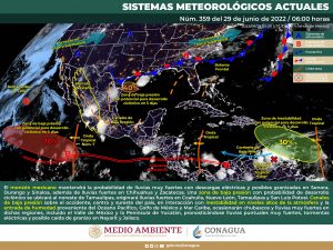 Este día, el monzón mexicano mantendrá la probabilidad de lluvias puntuales muy fuertes acompañadas de descargas eléctricas y posibles granizadas en Sonora, Durango y Sinaloa, así como fuertes en regiones de Chihuahua y Zacatecas. Por otro lado, una zona de baja presión con probabilidad de desarrollo ciclónico se ubicará al noreste de Tamaulipas y favorecerá la probabilidad de lluvias puntuales fuertes en Coahuila, Nuevo León, Tamaulipas y San Luis Potosí. Canales de baja presión sobre el occidente, centro y sureste del país, en interacción con inestabilidad en niveles altos de la atmósfera y la entrada de humedad proveniente del Océano Pacífico, Golfo de México y Mar Caribe, ocasionarán chubascos y lluvias muy fuertes en dichas regiones, incluido el Valle de México y la Península de Yucatán, pronosticándose lluvias puntuales muy fuertes, tormentas eléctricas y posible caída de granizo en Nayarit y Jalisco. Finalmente, se pronostica ambiente caluroso a muy caluroso en entidades del noroeste, norte y noreste de la República Mexicana, con temperaturas máximas superiores a 40°C en el noreste de Baja California, noroeste de Sonora y norte de Sinaloa.