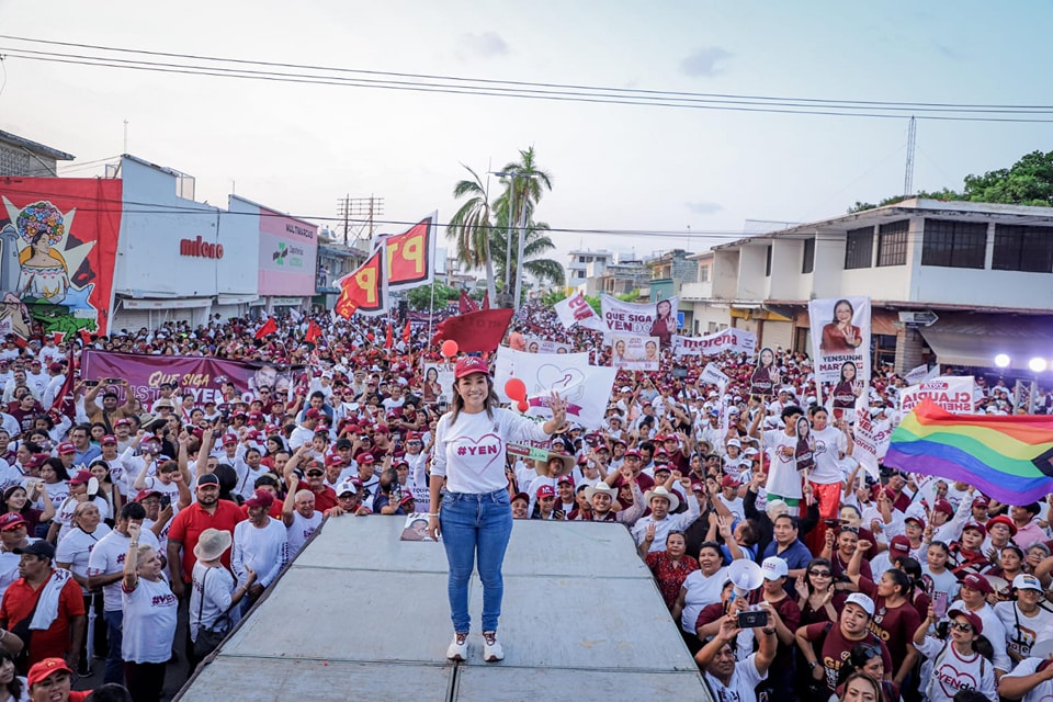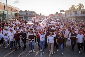 CHETUMAL, 26 de mayo. – Arropada por cerca de 15 mil vecinos simpatizantes provenientes de la zona limítrofe, de la ribera del río Hondo y de las colonias populares de la capital, la candidata de Morena a la presidencia municipal de Othón P. Blanco, Yensunni Martínez Hernández cerró campaña proselitista la tarde de este domingo en céntricas calles de Chetumal con el mensaje de que se oiga lejos, fuerte y claro, el 2 de junio Morena va arrasar por la voluntad del pueblo.