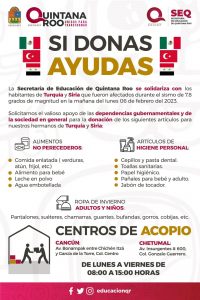Por otra parte se informó que a través de la Secretaría de Educación de Quintana Roo (SEQ), se solidariza con los habitantes de los países Turquía y Siria, quienes en estos momentos sufren las graves consecuencias derivadas del terremoto de 7.8 grados de magnitud que afectó el pasado lunes 6 de febrero, con la apertura de dos Centros de Acopio en sus oficinas de Cancún y Chetumal.