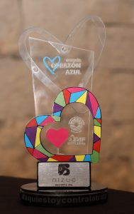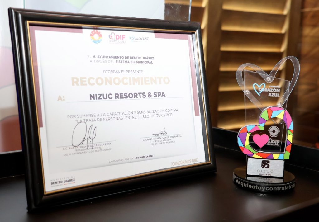 BENITO JUÁREZ, 18 de octubre.- La directora general del Sistema para el Desarrollo Integral de la Familia (DIF) Benito Juárez, Marisol Sendo Rodríguez, entregó el distintivo “Corazón Azul” al hotel Nizuc Resort & Spa, como reconocimiento a su compromiso en la lucha para la sensibilización a su personal contra el delito de trata de personas que atenta contra la dignidad humana.