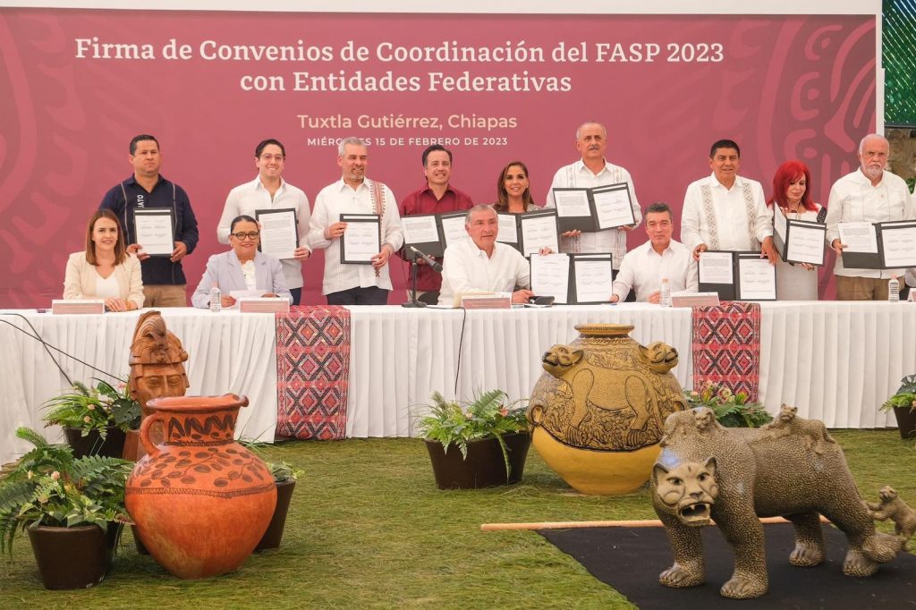 CHIAPAS, 15 de febrero.- En el marco de la firma de convenios de concertación del Fondo de Aportaciones para la Seguridad Pública (FASP) 2023 celebrada en esta ciudad, la gobernadora de Quintana Roo Mara Lezama Espinosa destacó el trabajo de los tres órdenes de gobierno con la meta de que la gente viva en paz, con tranquilidad y seguridad. Este año la federación transfiere a la entidad 220 millones de pesos para garantizar la efectividad de la Estrategia Nacional de Seguridad Pública del país.
