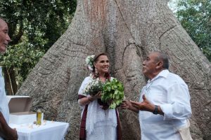 Ahí le entregaron un collar de flores guindas y un ramo de flores blancas con rosas rojas y luego se encaminó hasta el árbol, donde fue recibida por dignatarios encabezados por el presidente del Consejo Maya que avaló el nombramiento, Nasiano Poot Chan, junto a una mesa con panes, frutas y agua y el encargado de la ceremonia, Policarpio Pool.