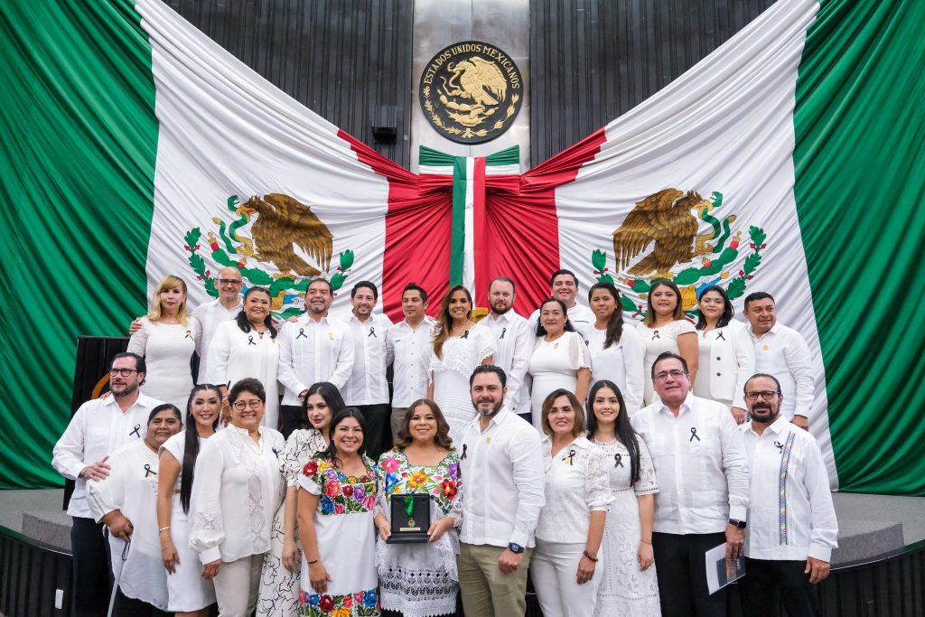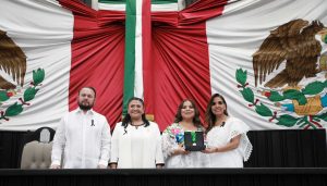 En Sesión Solemne de la XVII Legislatura, la diputada Mildred Ávila Vera, presidenta de la Mesa Directiva, la gobernadora del Estado Mara Lezama Espinosa, el magistrado Heyden Cebada Rivas, presidente del Tribunal de Justicia del Estado, entregaron la presea a la actual titular del Instituto Quintanarroense de la Mujer, María Hadad Castillo.