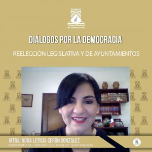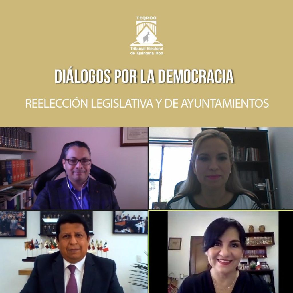 Chetumal, Q. R. – Como parte del 9º Diálogo por la Democracia el Tribunal Electoral de Quintana Roo realizó la mesa de análisis “Reelección Legislativa y de Ayuntamientos”, con la participación como panelistas Roxana Lili Campos Miranda, diputada de la XVI Legislatura del Congreso del Estado de Quintana Roo; Leopoldo Gama Leyva, Posgrado Centro de Investigaciones Jurídico-Políticas Universidad Autónoma de Tlaxcala y Jorge Sánchez Morales, Magistrado Presidente de la Sala Regional Guadalajara del Tribunal Electoral del Poder Judicial de la Federación; la moderación estuvo a cargo de Nora Leticia Cerón González, Magistrada del Tribunal Electoral de Quintana Roo.