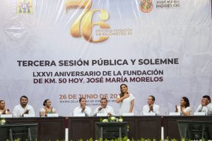 JOSÉ MARÍA MORELOS, 26 de junio.- Acompañando a las autoridades municipales, la gobernadora Mara Lezama Espinosa asistió a la Tercera Sesión Pública y Solemne de Cabildo con motivo del 76 aniversario del Kilómetro 50, hoy ciudad de José María Morelos en la que dijo que la transformación que lleva a cabo su administración obliga como mandato histórico y un imperativo ético reivindicar la zona maya, a la cultura originaria.