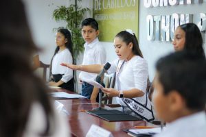 CHETUMAL, 8 de mayo. – En el marco de los festejos por el Día del Niño, este lunes por la mañana, se llevó a cabo la sesión de Cabildo Infantil, en donde rindieron protesta para cada uno de los cargos conferidos, encabezados por la presidenta municipal Ashly Nicole Trejo Gutiérrez.
