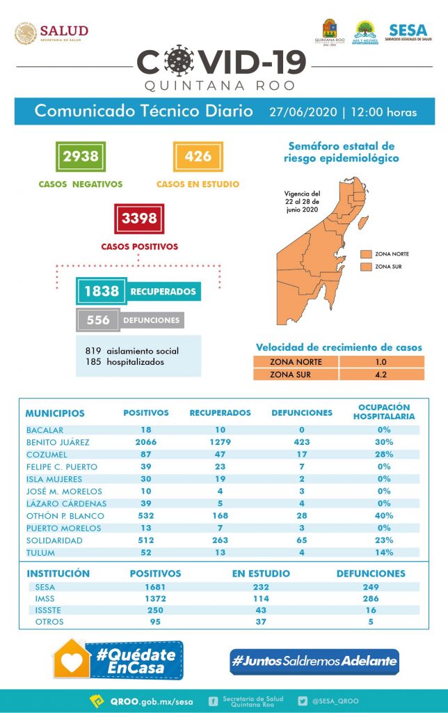 Cancún, Q.R. – La Secretaría de Salud informó que Quintana Roo superó la cifra de mil casos activos de Coronavirus Covid-19; al corte de las 12 del día de hoy se tenían mil 4 personas contagiadas activas, de las cuales 819 están en sus viviendas “en aislamiento social” y 185 hospitalizadas. La cifra de muertos es de 556. Total histórico de 3 mil 398. 426 en espera de resultados de análisis.
