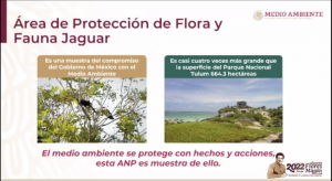 MÉXICO, 27 de julio.- El presidente Andrés Manuel López Obrador publicó hoy en el Diario Oficial de la Federación (DOF) el Decreto mediante el cual se crea el Área de Protección de Flora y Fauna Jaguar (APFF Jaguar), en el municipio de Tulum, en el estado de Quintana Roo, con el cual México ya suma 185 Áreas Naturales Protegidas federales.