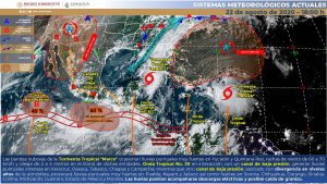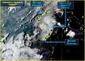 El centro de la Tormenta Tropical “Marco” ingresa al Golfo de México y se localiza a 135 km al noreste de Cabo Catoche, Q. Roo. Sus bandas nubosas ocasionan lluvias fuertes a muy fuertes en Yucatán y Quintana Roo.