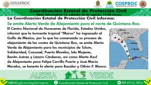 Se emite Alerta Verde de Alejamiento para el norte de Quintana Roo. La tormenta tropical “Marco” ha ingresado al Golfo de México, por lo que ha comenzado su proceso de alejamiento de las costas de Quintana Roo.