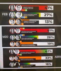Para el 30 de abril, la diferencia solo es de 9 puntos mismos que de seguir así serían fácilmente remontados por Palazuelos en los 27 días que faltan de campaña, ya que la tendencia en aire y tierra es de franca ascendencia a favor de los candidatos emecistas.