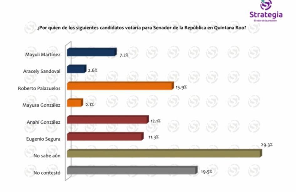 CANCÚN, 2 de mayo. – GobernArte, empresa encuestadora que le ha dado seguimiento a la intención del voto en Quintana Roo, informó que Roberto Palazuelos y Mayusa González, candidatos al Senado del partido Movimiento Ciudadano están en segundo lugar, a tan solo 9 puntos de los abanderados punteros en este proceso electoral en la entidad.
