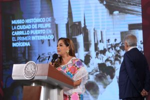 “En su paso por nuestra zona maya, en donde en respuesta a una añeja y legítima demanda de los carrilloportenses, se ha comenzado a construir la tan ansiada Puerta al Mar, para conectar a este hermoso municipio con el Caribe Mexicano, un viejo anhelo y un legítimo derecho de los habitantes, un espacio lleno de historia de la lucha indígena”, explicó la Gobernadora.