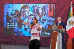 Sobre la inversión histórica en obras que se realizan en la ruta del Tren Maya, añadió que en la estación Nicolás Bravo/Kohunlich, se inició la construcción del Mercado del Bienestar Maya, donde las bordadoras, artesanos, talladores, cañeros, productores de miel, entre muchos otros, podrán exponer sus productos, para que los turistas puedan comprar y fortalecer así la economía familiar de la gente que vive en las comunidades aledañas.