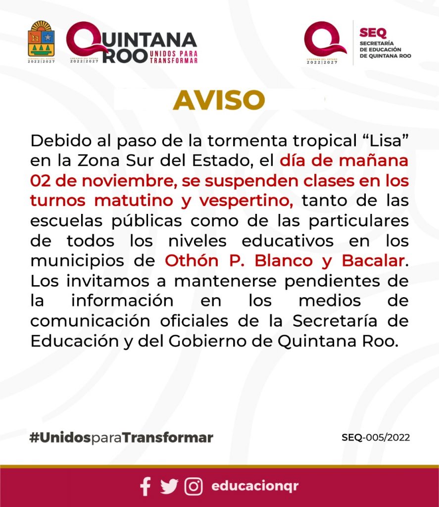 Chetumal. Q.R. – La gobernadora del Estado Mara Lezama Espinosa, anunció la suspensión de clases en todo el sistema educativo público y privado este miércoles, en los turnos matutino y vespertino, únicamente en los municipios de Othón P. Blanco y Bacalar. Durante la instalación de la Sesión Extraordinaria del Consejo Estatal de Protección Civil para la tormenta tropical “Lisa”, en donde anunció también la suspensión venta de bebidas alcohólicas en los dos municipios.
