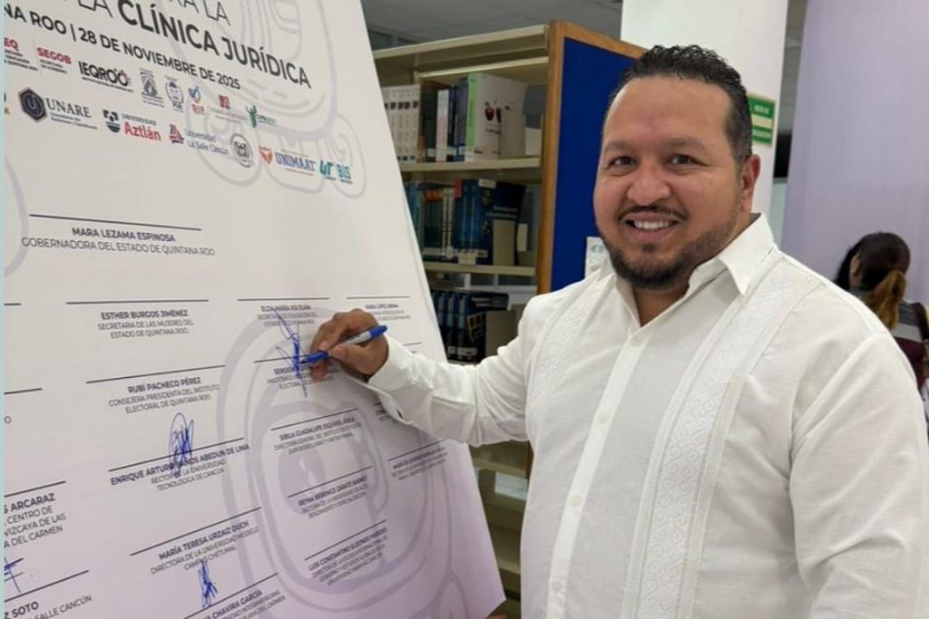 CANCÚN, 1 de diciembre.- El Magistrado Presidente del Tribunal Electoral de Quintana Roo (TEQRoo), Sergio Avilés Demeneghi, participó como firmante para la implementación de la primera Clínica Jurídica de las Mujeres, iniciativa impulsada por la Secretaría de las Mujeres y colegios de abogados y psicólogos.