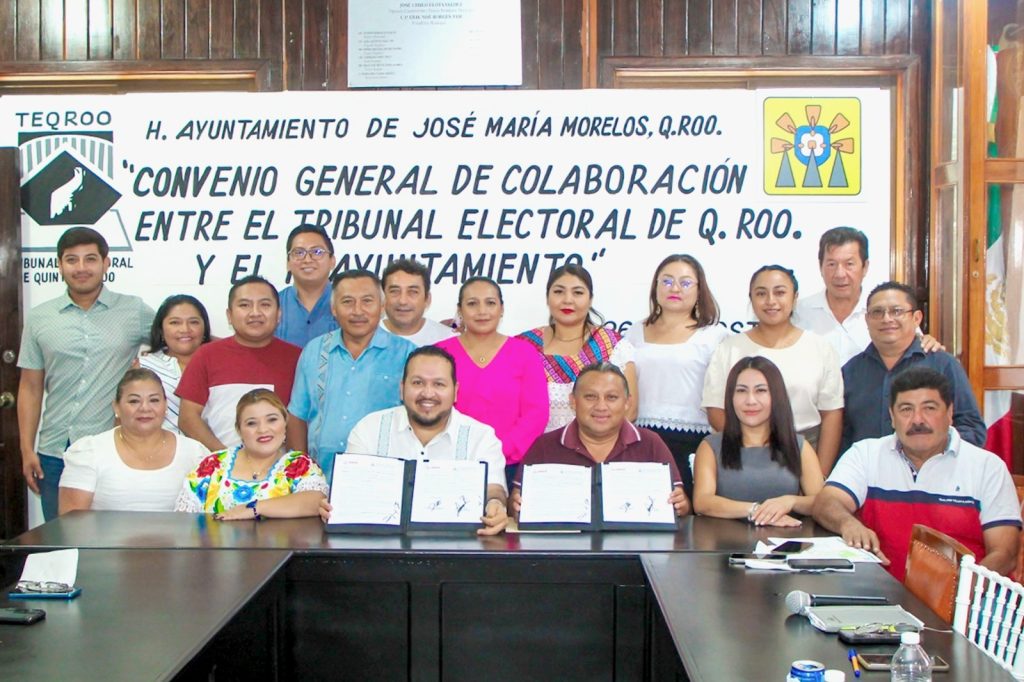 JOSÉ MARÍA MORELOS, 26 de agosto. – El Tribunal Electoral de Quintana Roo (TEQRoo) y el Ayuntamiento de José María Morelos celebraron la firma de un convenio de colaboración con el propósito de fortalecer la cultura democrática y garantizar la promoción y defensa de los derechos político-electorales de la ciudadanía, especialmente de los grupos en situación de vulnerabilidad.