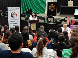 Buendía Cortez compartió con las personas asistentes la lucha social y jurídica que ha emprendido por más de 13 años para lograr el acceso a la justicia para su hija y todas aquellas mujeres víctimas de violencia.