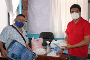 En representación de la alcaldesa Alcocer Alcocer, el oficial mayor de la comuna Asís Rahiv Segoviano Reyes, entregó a las direcciones de Servicios Públicos y Catastro Municipal, insumos y enseres para evitar la propagación del COVID-19, entre el material entregado se cuentan: tapetes desinfectantes, mascarillas, cubrebocas, y gel alcohol al 70 por ciento, así como líquido desinfectante.